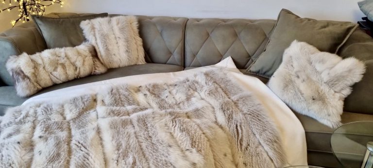 Aus zwei langen Jacken entstanden diese besonderen Unikate – eine aus Luchs, die andere aus Blaufuchs. Beide wurden mit viel handwerklichem Gespür zu eleganten Decken umgearbeitet und mit farblich abgestimmter Baumwolldecke auf der Rückseite und am Rand veredelt. Dazu passend entstanden Polster im gleichen Stil, die das Ensemble harmonisch abrunden.