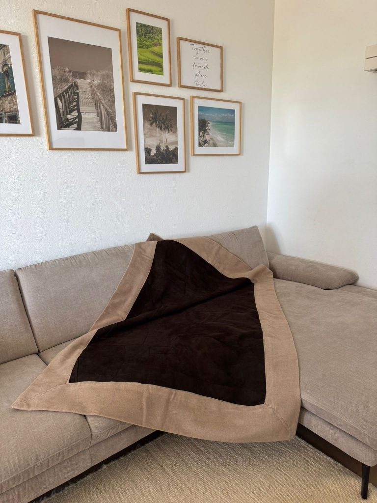 Aus einem ungetragenen Innenpelzmantel entstand diese elegante Decke – ein schönes Beispiel dafür, wie wertvolle Materialien ein neues Leben bekommen können. Auf der Vorderseite zeigt sich der Pelz in seiner ganzen Weichheit, die Rückseite besteht aus feinem Leder. Ein edles Stück, das Wärme und Stil vereint.